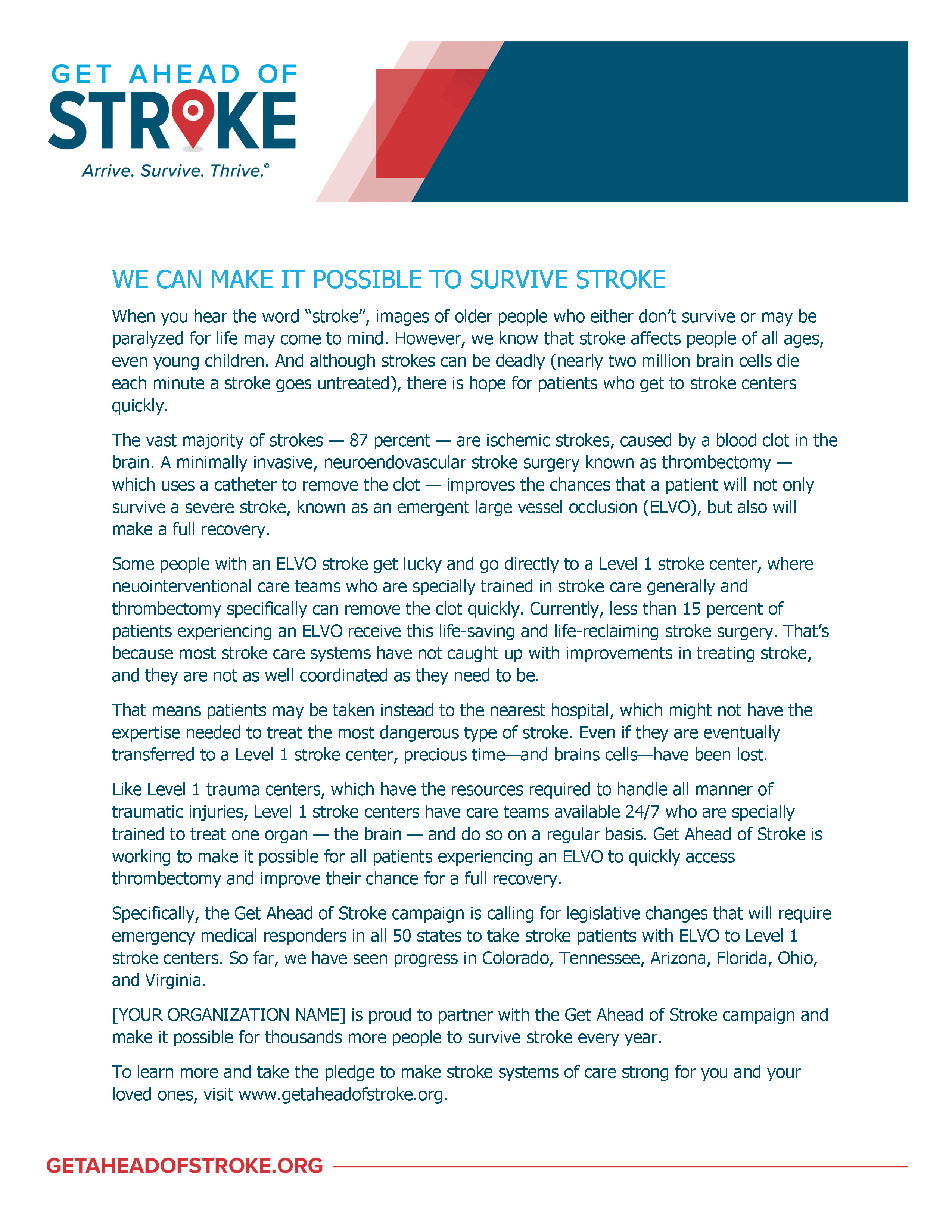 Your organization can use this article template to educate your members, partners, and the public about the Get Ahead of Stroke® campaign and why it matters. Use this Word document as is, or adapt it to include information about what your organization does to help patients #SurviveStroke.